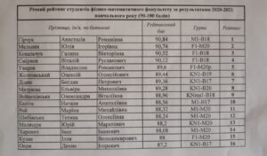 Шановні студенти! До вашої уваги рейтинговий список студентів факультету з найвищими балами успішності за 2020 – 2021 навчальний рік: