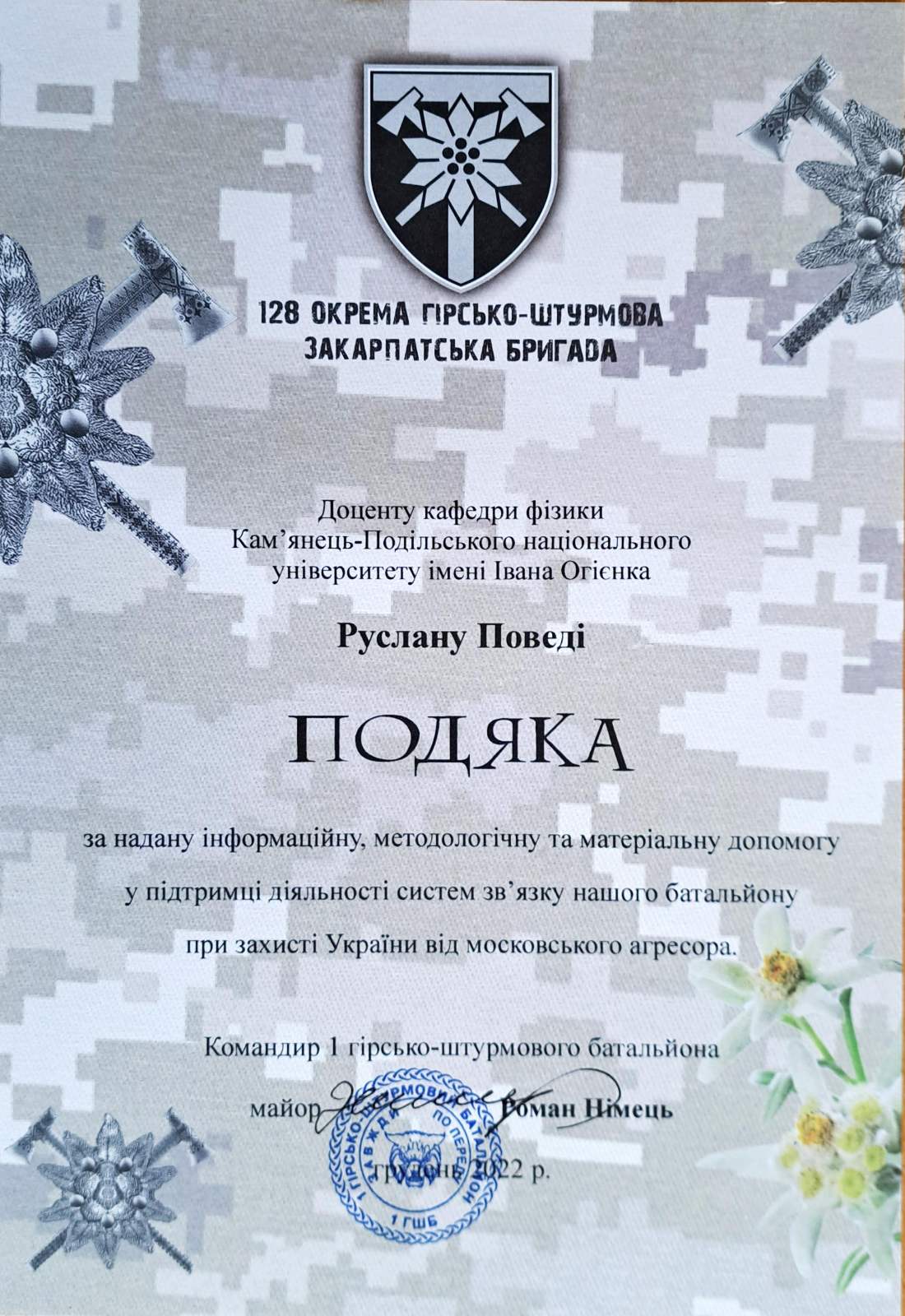 Доцент кафедри фізики, кандидат фізико-математичних наук, доцент Руслан Поведа отримав Подяку від 128 окремої гірсько-штурмової закарпатської бригади “за надану інформаційну, методологічну та матеріальну допомогу у підтримці діяльності систем зв’язку нашого батальйону при захисті України від московського агресора”.
