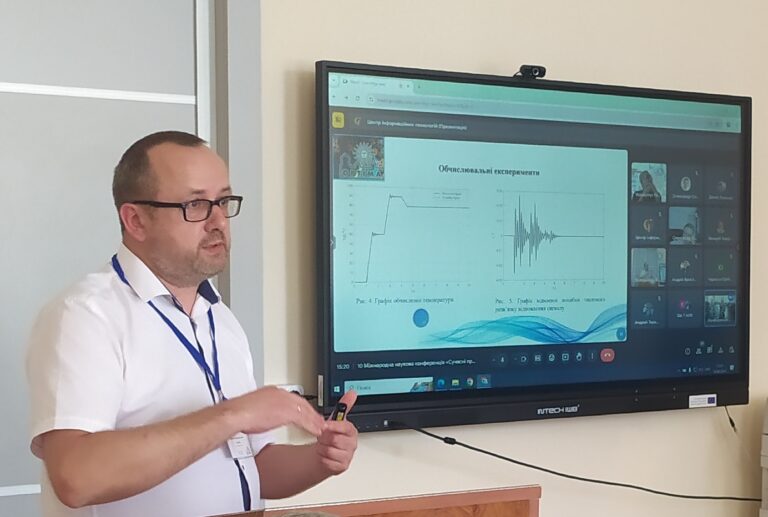 Наприкінці пленарного засідання було презентовано доповідь, яку підготували професор кафедри комп’ютерних наук Університету Огієнка Володимир Анатолійович Федорчук і завідувач нашої кафедри Віталій Анатолійович Іванюк, упродовж якої було сфокусовано увагу на позитивних властивостях використання моделей в інтегральній формі, а саме – у задачах відновлення вхідних сигналів нелінійних вимірювальних перетворювачів.