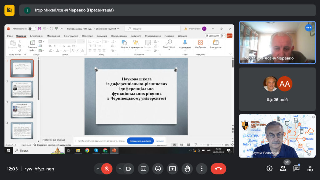 Потім виголошував свою доповідь завідувач кафедри математичного моделювання Чернівецького національного університету імені Юрія Федьковича професор Черевко Ігор Михайлович, який розповів слухачам про наукову школу з диференціально-різницевих і диференціально-функціональних рівнянь, що функціонує у Чернівецькому університеті, а також про апроксимаційні схеми диференціально-різницевих рівнянь та їх застосування.