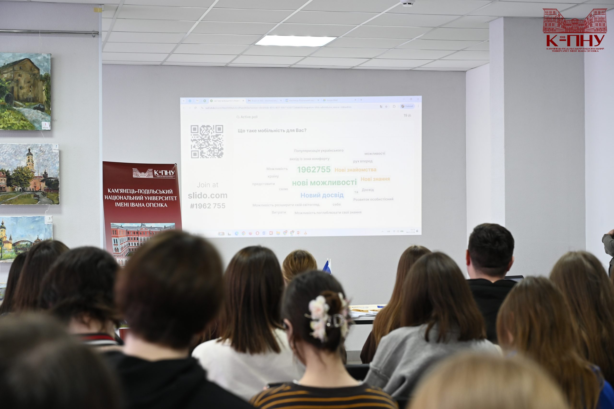 Інтерактивна частина розпочалася з онлайнового опитування на платформі Slido, де студенти висловили власне розуміння поняття «мобільність». Особливу увагу приділили програмі Erasmus+ KA171. Учасники переглянули відео студентів, які зараз перебувають на академічній мобільності в університетах-партнерах: Діани Чорнобай і Дар’ї Козак (Католицький університет у місті Ружомберок, Словаччина), а також Софії Донець (Римський університет Ла Сап’єнца, Італія). Марк Високін (Академія образотворчих мистецтв імені Яна Матейка, Польща) долучився до заходу онлайн. Учасники програми Erasmus+ KA171 поділилися власними враженнями від участі в обміні, розповіли про виклики й переваги академічної мобільності, а також дали поради майбутнім еразмусівцям.